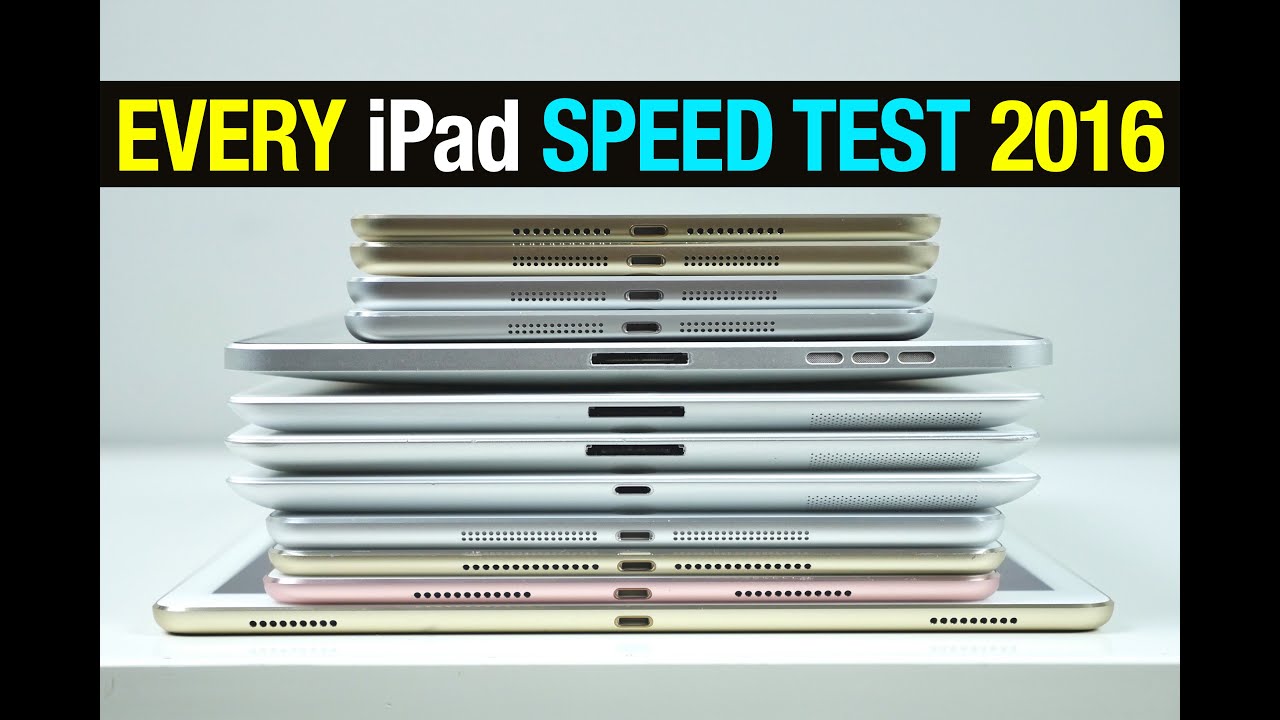 What's up guys everything Apple Pro here and in light of a recent release, I wanted to revisit this series, as is tradition and compare every single iPad ever made in a new 2016 version. So what's happened since the last version, there's been a new iOS 9 update, 9.3 and a new iPad, so chronological order there have been about six generations of iPads, everybody uses a laptop and or a smartphone, and the question is arisen lately. Is there room for a third category of device in the middle? Oh man, it's hard to imagine it's been six years already. The newest arrival is the new iPad Pro nine point: seven, an incredible tablet: one of the best displays an amazing camera very, very fast, but how does it compare to the rest? So, let's put every iPad to the test in 2016 and start with these startup tests now all are connected to the same power bank making sure they start at the exact same time. As you can see, I am running out of room on my wall, so I had to shift to the garage using the garage door. So first device to start up is the famous iPad Pro you'd think the second strongest would be next but nope the iPad Air 2.