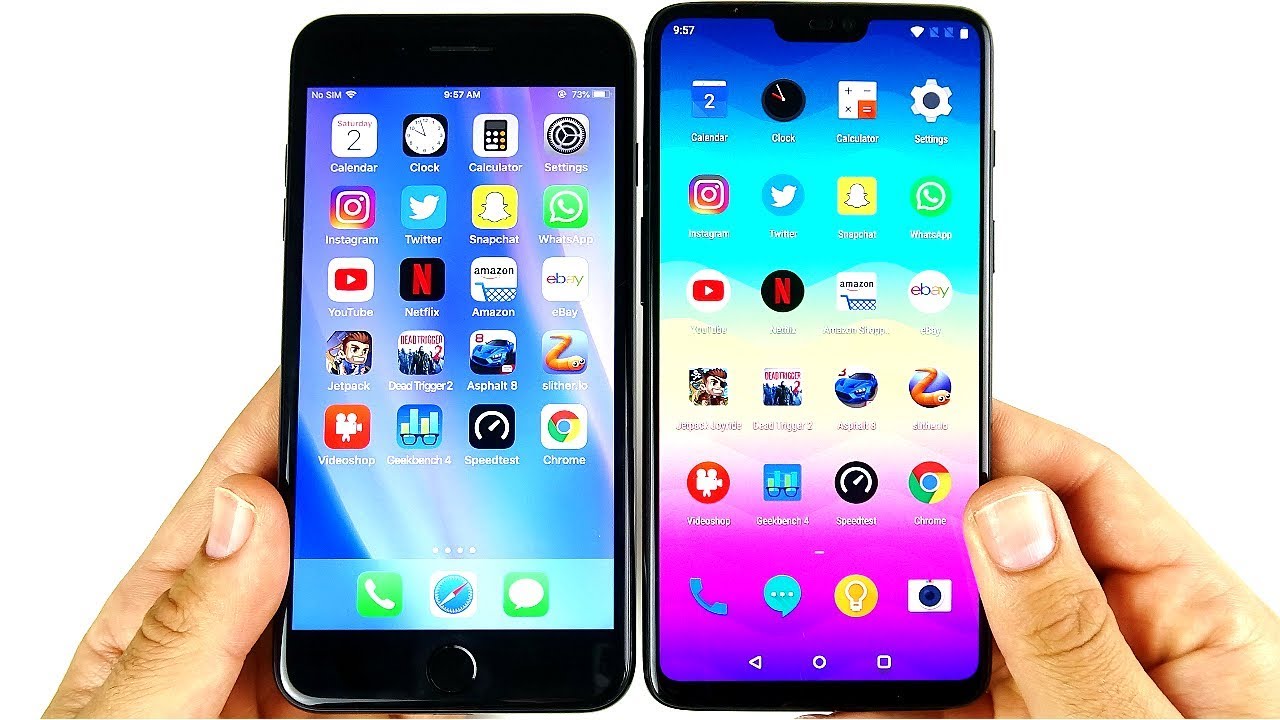 iPhone 7 plus vs. one plus six speed test coming up right. Now, let's go, so what is up guys Nick here, helping you to master your technology, iPhone 7, plus versus 1, plus 6, the iPhone 7 plus it's? Finally, a phone: that's in a similar category in price range as the 1 plus 6 3, 2 1, let's boot them up and see which one is quicker. Now the 256 gigabyte is gonna, be 629 and in the same price range as a 32 gigabyte, iPhone 7, plus from Apple. So you get like eight times the storage on the 1 plus 6 for the same price as the entry-level iPhone 7, plus here for 669 at Apple. Now, if you look on the third-party market, you will be able to find the iPhone 7 plus for a cheaper than any one plus 6, but the OnePlus 6 definitely faster there on the boot up test.