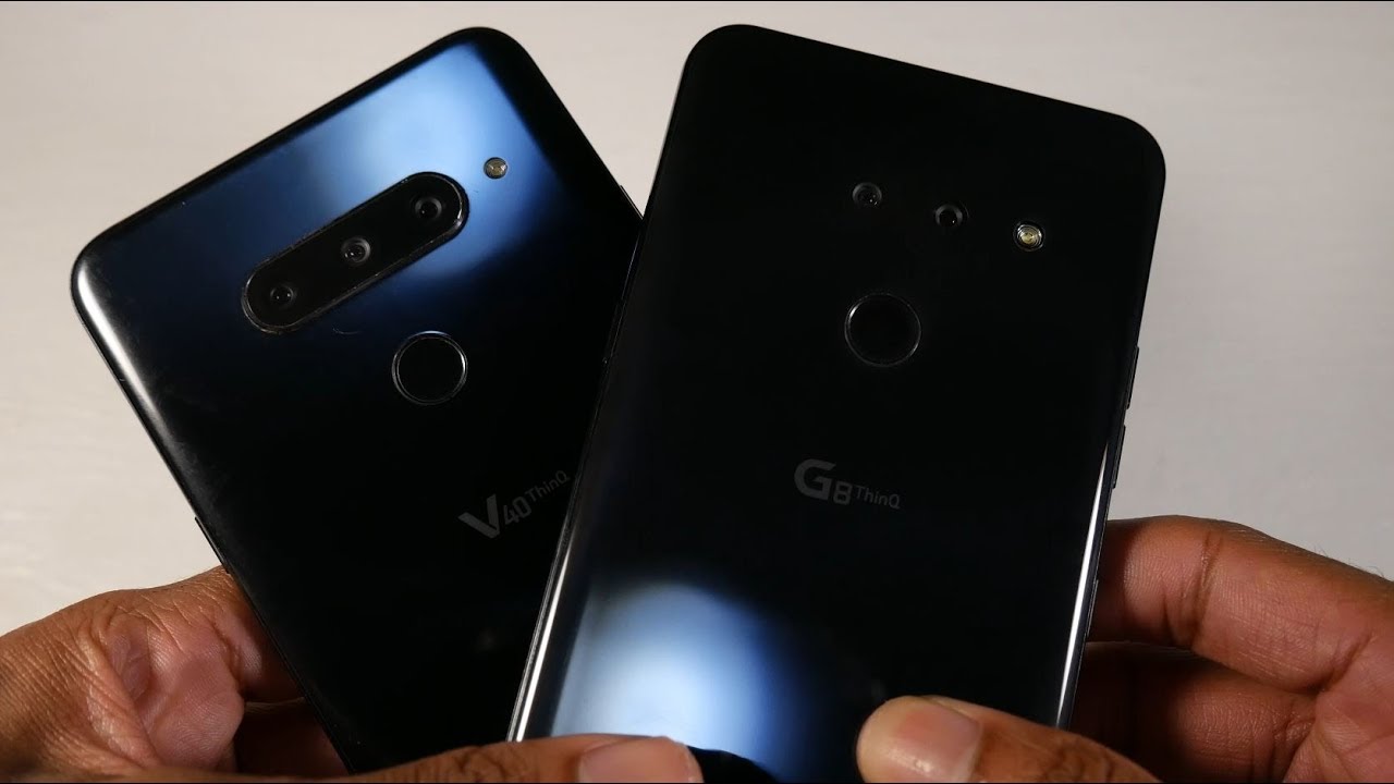 Where's, the glass got a request to do TV 40 versus the g8, so these phones have come very close and price since the GAA got that huge. You know price drop, as you can see, 260 right now and if we go look at the v40, it's 219. So if you want a strict budget, this is I, guess a big difference. If you want a really strict budget, but as you can see not too much of a difference here, so hardware wise on both these guys, the same color on here now you have a triple camera set up on the v40, and you have a dual camera set up when the g8 both have the fingerprint scanner in the exact same spot, LG brandy same button layout, as you can see the power buttons. If you can see that- and you also have the SIM tray same exact layout volume rockers on the other side, along with the Google Assistant buddy, now on the bottom, you have the same setup, USB type-c. They both have the headphone jack and one single firing speaker now.