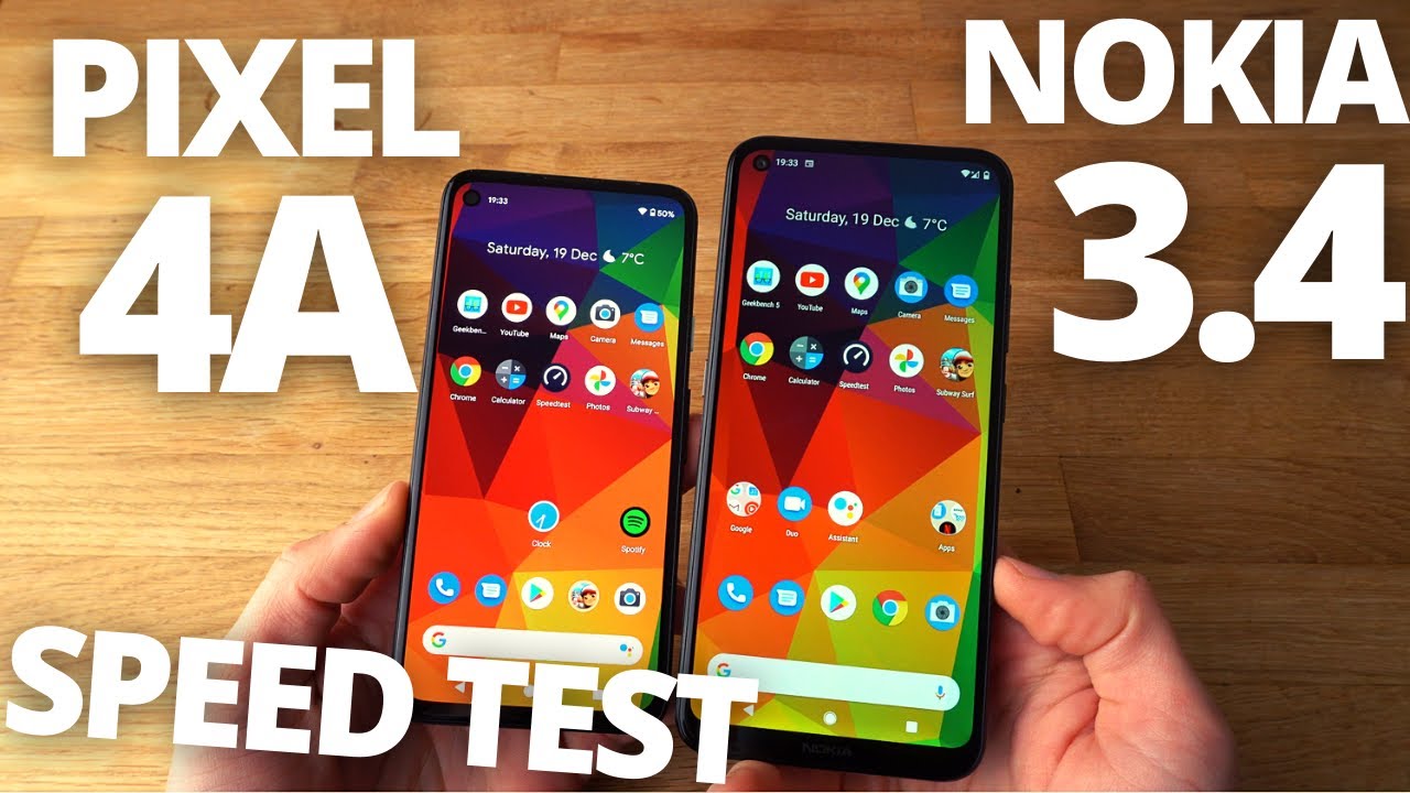 Hey there in this video, we will compare the speed performance of the new Nokia 3.4 and the Pixel 4a each time. One of them wins, so we get a b if both of them are incredibly close and there's no difference, both of them gets a b all right. Let's start with the power run test. Okay, so, as you saw, the 4a is much faster, while the Nokia is still loading, so bean goes to the pixel. Okay still has it loaded yeah. So now so pretty huge difference all right.