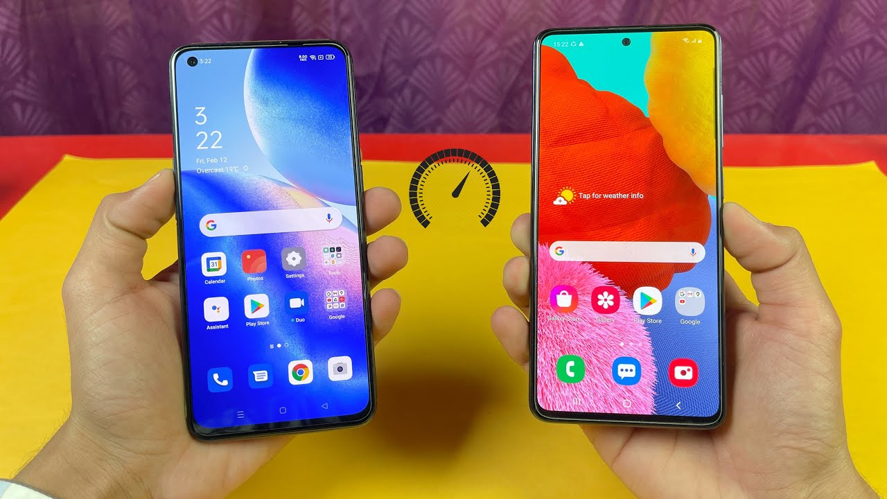 Hey guys, what's up it's time, to do a SP test comparison between the Oppo Renault 5 versus the Samsung Galaxy a51 and cars and the Samsung Galaxy a51, give you a Samsung Enos 9611 processors, with the 6gb of ram. There is a one more variant that give you GB of ram, but ramming man. It is already perfect on the a51. So while the opponent 5 give you a snapdragon 720 g chipset with 8gb of ram, so I'm really excited to see that how much the difference between these two devices so without any wasting time, let's get right into it. Now, let's see the boot up speed so now, let's quickly boot both of these phones up at the same time. Here we go logo.