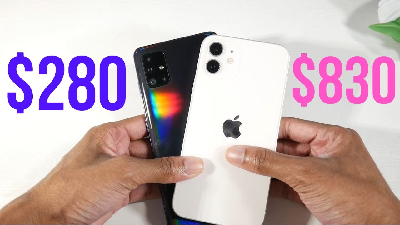 What is up guys today, we'll be comparing the Samsung Galaxy a51 one of the best-selling mid-rangers to the iPhone 12. So let's go ahead and get started. You can find the a51 brand new for around 267 I'll put the links down below iPhone brand new is going to cost you around 8 30. Uh. So let's go ahead and get started with the hardware of both of these phones. So, as you can see the a51 a little taller than the iPhone 12 and definitely a little thinner as well, so glass and metal on the iPhone, and you have a plastic design on the a51, and they actually don't feel too far off, because I believe they made the iPhone a little lighter this year, and you can definitely tell, so they're, not the a51 is not like a super light, cheap feeling phone.