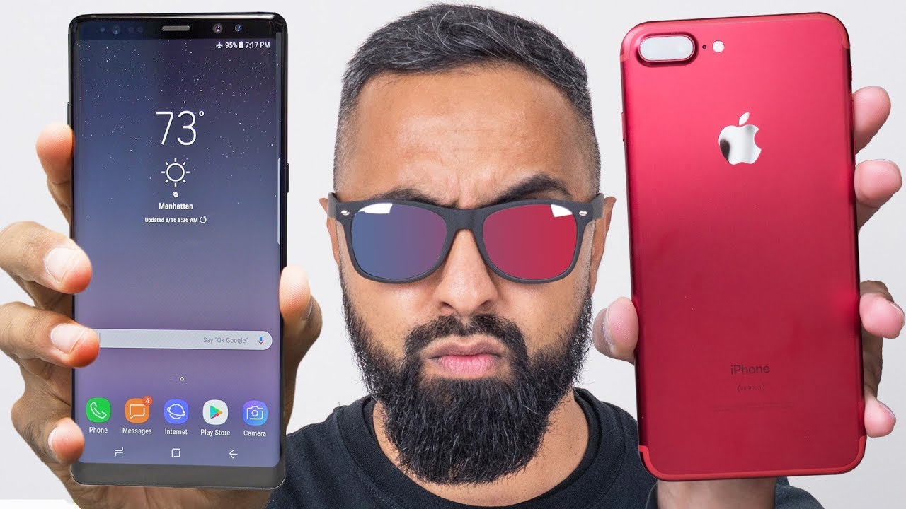 What's of YouTube's, after on super-safe TV and in this video, we're gonna, be comparing the Samsung Galaxy Note 8 to the iPhone 7 plus whoa. Why are we comparing the iPhone 7 plus when it's almost a year old? Well, it's currently what's available right now, and we'll redo this comparison when the new iPhone 8 and the iPhone, 7s, plus or out next month, so starting for the side. Differences both of these are quite large devices. But the note date is slightly taller. It's also slightly thicker, but it's slightly narrower compared it to the iPhone 7 plus, and this is because of the new 18 point 5 by 9 aspect ratio that the note 8 has compared to 16 by 9 on the iPhone, 7 plus, and the note 8 does have a much larger display, 6.3 inches compared to 5.5 inches on the iPhone 7 plus, and that is because of the infinity display that we have here on the note 8, which has minimal bezels. Now the iPhone 8 is rumored to have very small bezels, but the iPhone, 7s, plus I, believe, is still gonna, have pretty large vessels.